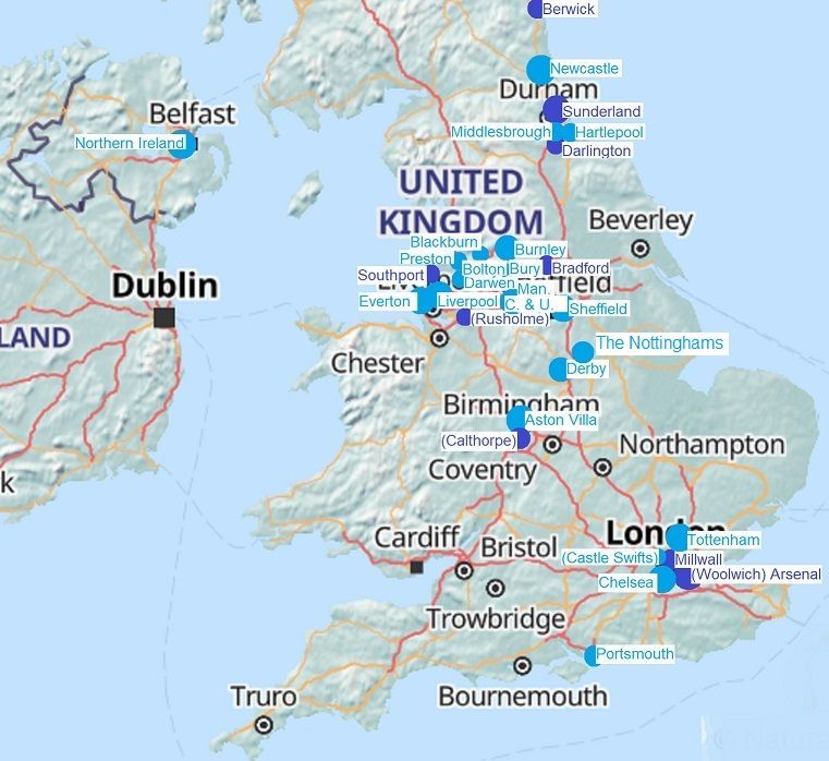 Moreover, all three would be examples of what would become an increasing trend. Other clubs begun by "North Britons" were the Nolli-brothers' Hartlepool St. Augustine in England's North East, Rusholme in Manchester, Southport in Lancashire, in London both Millwall and Arsenal and finally late-comer Bradford in Yorkshire. And then there were the Caledonian tactics and footballing philosophy that were adopted, most with an infusion of Scots players, a few without, by clubs from 1878 into the new century and from Darwen and Villa via the Merseyside and Manchester clubs, though the East Midlands and London, notably Tottenham and Chelsea, to the South Coast's Portsmouth.