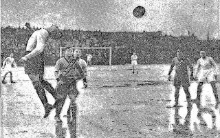 And, that is it. Johnny Nelson continued to live in New York until his death in 1984 at the age of seventy-nine and appears to have had nothing to do with football again. There is no known description of him other than he was a man who always seemed to have somewhere else to be and, although inducted into the U.S. Soccer Hall of Fame in 2005, there is no known picture of him either. The moment of his final injury was recorded and is said to be shown in the picture above. But which of the players he is on what seems to have been a filthy as well as fateful night is unclear. He is somewhere in the Nationals team picture also shown above. Bob Millar is the bald man in the centre in the front row with the ball but which is Johnny is again unclear. It seems typical of a man, who appears to have been quiet and unassuming almost to a fault, and poses a conundrum. How with Archie Stark making himself unavailable was he, as the country's second best striker, not selected for the US team for the 1930 World Cup? Millar was team manager and from the Nationals he knew his qualities at first hand. Was it because not only was he Scots-born he was then also still a British citizen or simply because he was clearly just not one of the lads?  And, of course, there is always the same question as with Stark. Had either been there, would the result, the 1930 World Cup result, have been different, indeed might the USA have won?